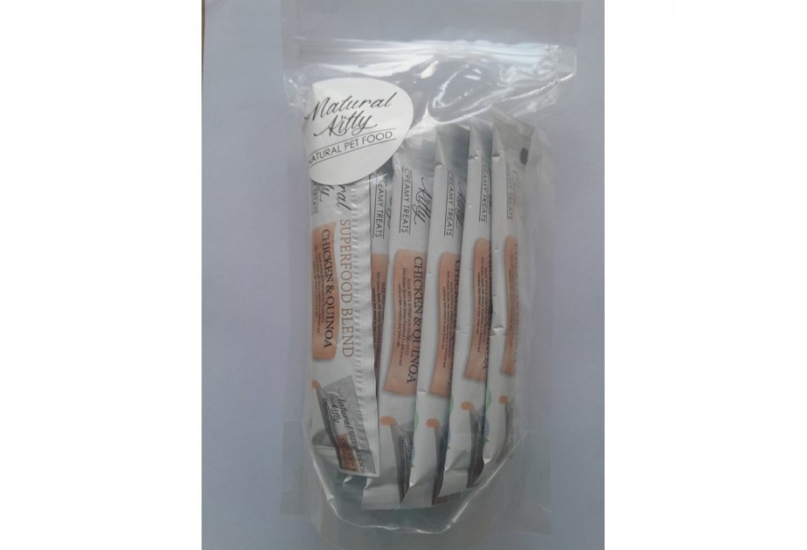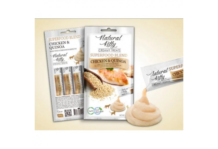 Кремовые стики сделаны из 100% натуральной курятины и смешаны с киноа (суперфуд), чтобы сохранить питательные свойства киноа и обеспечить вкусное лакомство, которое, как было доказано, полезно для кошек. Это лучшая ежедневная награда для ваших кошек. Вы можете кормить своих кошек каждый день с помощью Natural Kitty Creamy Treats в качестве поощрения или лакомства, а также в качестве легкого перекуса или дополнения к основному приему пищи ваших кошек. Киноа не содержит глютена, содержит большое количество белка и является одним из немногих растительных продуктов, содержащих достаточное количество всех незаменимых аминокислот. Он также богат клетчаткой, магнием, витаминами группы В, железом, калием, кальцием, фосфором, витамином Е и целым рядом полезных антиоксидантов.
