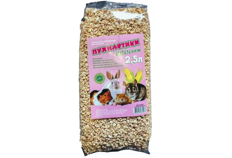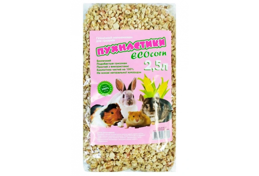 Наполнитель Пушистики ECOcorn кукурузный для грызунов — гипоаллергенная гигиеническая подстилка для грызунов. Идеально подходит для питомцев страдающих аллергией на хвойные и другие наполнители. Используется в качестве подстилки для клеток мелких животных: кроликов, морских свинок, мелких грызунов, попугаев, рептилий, хорьков и других. 100% натуральный, экологически чистый продукт. Состоит на 100% из высушенных стержней початков кукурузы, измельченных до размера мелкой фракции (около 2 — 4 мм), без добавления каких либо примесей. Быстро поглощает влагу и нейтрализует посторонние запахи. Не содержит пыли, подлежит компостированию, более тяжелые гранулы, чем в обычном древесном наполнителе, исключают прилипание к лапкам и шерсти животных утилизируется в канализацию. Не забивает бытовые туалеты и легко утилизируется в компостных ямах превращаясь в органическое удобрение.
