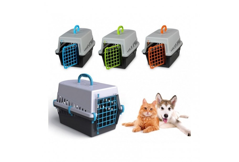 Пластиковая переноска для домашних животных Цвет: светло-серый со светло-голубыми, зелеными и оранжевыми деталями Размеры: 50 x 33 x 32 см Переносимость: вручную Застежки сбоку Пластиковая фиксирующая сетка Подходит для собак, кошек и мелких грызунов.