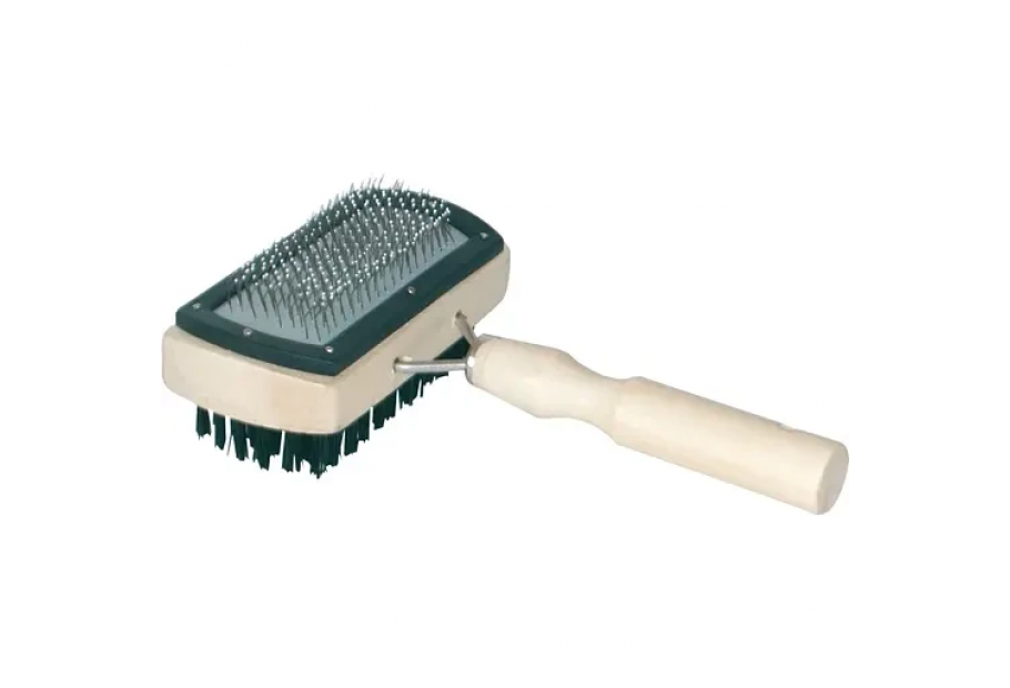 Одна сторона щетки оснащена тонкими металлическими зубцами с защитными шариками, которые эффективно удаляют подшерсток и распутывают колтуны, не повреждая кожу животного. Другая - из нейлоновой щетины. Она предназначена для финального расчесывания и придания шерсти блеска. Она мягко массирует кожу, стимулируя кровообращение и способствуя здоровью шерстяного покрова.