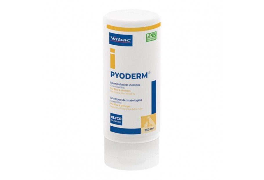 Virbac Pyoderm - лечебный шампунь с хлоргексидином, который обладает антибактериальными и противогрибковыми свойствами и не вызывает раздражения кожи. Особенно рекомендуется при лечении бактериальных и грибковых заболеваний кожи, в том числе при лечении поверхностной и глубокой пиодермии.