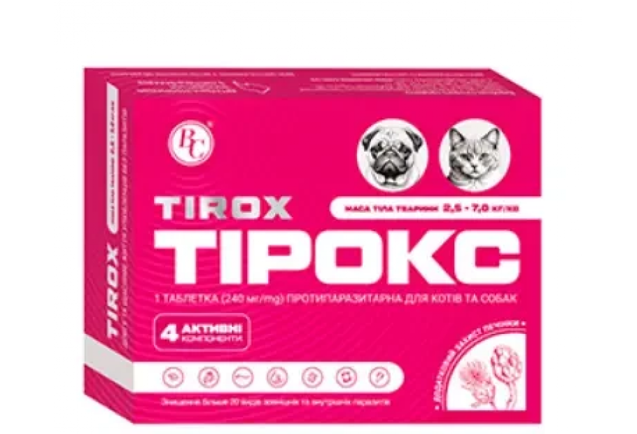 Комбинация люфенурона, моксидектина, празиквантела, нитенпирама, входящих в состав препарата ТИРОКС, обеспечивает широкий спектр противопаразитарного действия у собак и кошек по отношению к эктопаразитам: блох, саркоптиформных клещей, тромбидиформных клещей и эндоразитов. личиночных стадий развития дирофилярий.