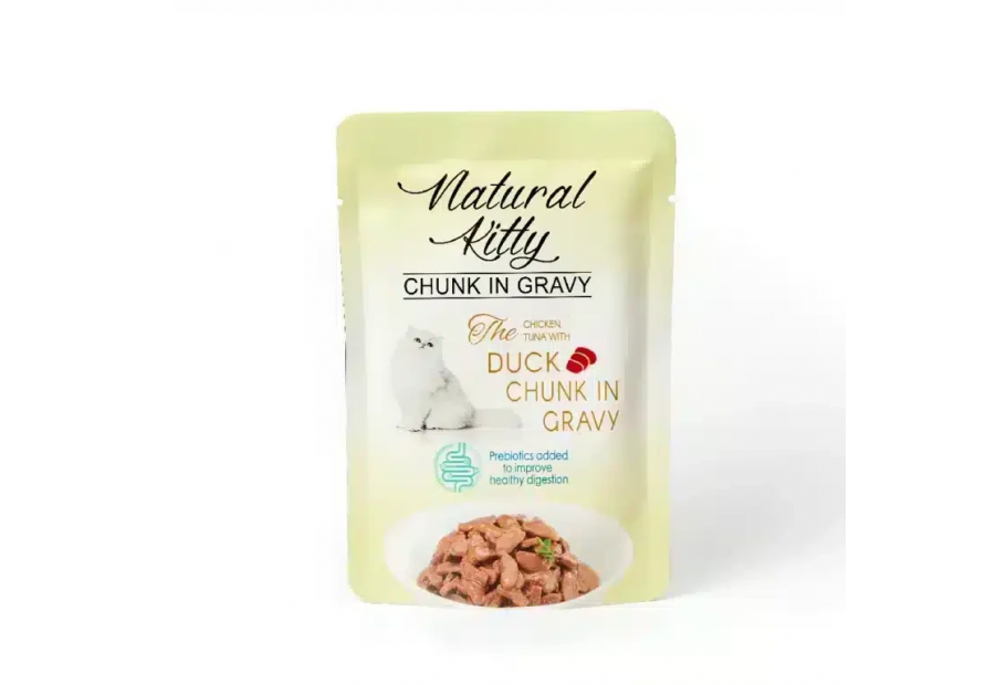 Natural Kitty Chunk in Gravy Chicken, Tuna with Duck - полноценный сбалансированный влажный корм со вкусными кусочками натуральной курицы, тунца и утки в ароматном соусе, который покорит вашу кошку. Помещен в удобные пакетики-паучи, чтобы вы могли угостить питомца в любое время и в любом удобном для вас месте. Пакетики можно брать с собой во время путешествий с котом или при посещении выставки, а также их легко использовать дома, чтобы быстро накормить нетерпеливого питомца.